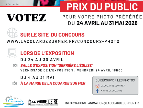 Le prix du public sera remis le 10 août prochain et prétexte évidemment à une petite fête accompagnée de musique tzigane avec Gashka Trio. Mais avant cela, encore faut-il pouvoir contempler et faire son choix… Le public de La Couarde et d’ailleurs est donc invité à venir découvrir la sélection dès le 24 avril et jusqu’au 30 à la Galerie Derrière l’Église à La Couarde. Passé ce délai, les photos seront visibles en mairie. A noter également que les tirages photos seront accessibles à la vente et que les recettes iront au Centre communal d’action sociale de la commune.