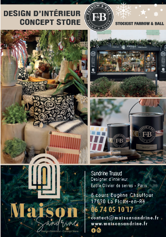 À La Flotte, Maison Sandrine s’impose comme la boutique idéale pour des cadeaux raffinés et une décoration inspirée. Distributeur et stockiste Farrow & Ball, la maison propose peintures et papiers peints iconiques, ainsi que la marque française Argile Peinture, reconnue pour ses teintes subtiles et minérales. La sélection déco est tout aussi prestigieuse : Maison Janette, Serge Lesage (tapis), Dareels, Gommaire, DCW Éditions (luminaires), Ferm Living, Gabrielle Paris… un véritable écrin d’art de vivre. Pour les fêtes, la boutique regorge d’idées cadeaux originales, comme les Ollas de la marque française PEPIN, élégantes et écologiques pour chouchouter les plantes. Des bons cadeaux sont également disponibles. Maison Sandrine, c’est aussi une expertise complète en design d’intérieur : conseils à domicile, choix des couleurs, aménagement et conception de projets sur mesure. Tous les services sont détaillés sur son site. Un lieu élégant, inspirant, chaleureux : Maison Sandrine est l’adresse idéale pour trouver la pièce coup de coeur… ou imaginer votre intérieur rêvé.