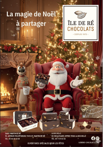 Nos lutins artisans chocolatiers travaillent chaque jour avec passion pour vous préparer une collection de spécialités alliant tradition, savoir-faire et originalité. Leur mission : vous offrir les meilleurs chocolats et les plus belles confiseries pour vos cadeaux et vos repas de fin d’année. Venez dans nos boutiques et composez vousmême vos ballotins en choisissant parmi une large sélection de chocolats fourrés de praliné, de délicieux caramel au beurre salé, ou encore d’étonnantes ganaches fondantes. pourrez également savourer nos truffes en chocolat, aiguillettes et clémentines enrobées, mendiants noir et lait, marrons glacés, ou encore nos coffrets festifs de spécialités variées, autant de douceurs qui enchanteront vos fêtes de fin d’année. A bientôt dans nos boutiques ! Boutique de Saint-Martin de Ré 15, avenue de Philippsburg Tél. 05 46 09 22 09 Boutique de La Rochelle 55, boulevard Joffre Tél. 05 17 81 03 33