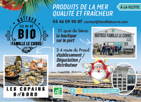 L’ostréiculture chez les Le Corre est une passion et un métier depuis plus de cinquante ans. Tout a commencé en 1966 sur l’île de Ré avec Jean et Solange Le Corre. Leur fils Hubert a ensuite repris le flambeau pour poursuivre avec ardeur le travail entrepris. Aujourd’hui c’est Éric et Charlène qui perpétuent la tradition. Le métier d’ostréiculteur demande beaucoup d’attention, de savoir-faire et de rigueur. Du captage à l’élevage des naissains en passant par la création des parcs, la mise en poche, la collecte, le nettoyage… Les Huîtres Le Corre sont élevées avec soin et passion. La famille Le Corre et son équipe vous accueillent chaleureusement dans leur boutique située sur le port de La Flotte où vous pourrez retrouver leurs délicieuses huîtres bio des numéros 1 à 4, les plates et les spéciales. Vous avez la possibilité de commander vos bourriches sur la boutique en ligne. Celles-ci sont livrées partout en France sous 24 heures. Pour les fêtes, laissez-vous séduire par les plateaux de fruits mer : Le Matelot à 14,90 € la part, Le Bosco à 24,90 € la part et La Capitaine à 34,90 € la part.