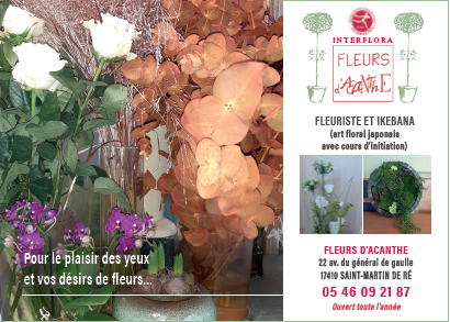 C’est dans un cadre ouvert et chaleureux que Christophe et Thérèse vous accueillent avec bienveillance et professionnalisme à Saint-Martin de Ré extra-muros. Fleurs et plantes pour vos envies et confidences pour tout événement : anniversaires, fêtes, mariages, décoration de réception, obsèques…, en partenariat avec le service Interflora pour la France et l’étranger. Flore concept, Fleurs d’Acanthe vous propose pour les fêtes de fin d’année : des compositions florales, des décorations de Noël, des luminaires et sujets lumineux, suspensions, cloches à vent pour un univers ouvert aux sens, encens parfumés et bols ou coupes en céramique du japon, tabliers pour le plaisir de cuisiner, carnets pour y inscrire vos sentiments, vos souvenirs de voyage, cartes de Noël en bois, des fleurs et éléments de composition pour assembler soi-même de jolis bouquets… Des tas d’idée cadeaux pour offrir et se faire plaisir.