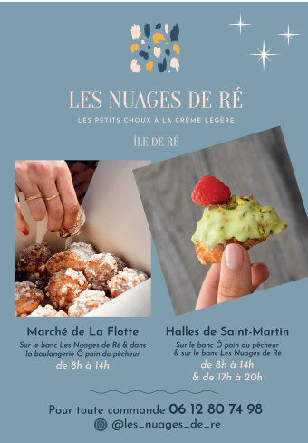 Passionné de pâtisserie, Adrien s’est formé à travers ses voyages en Australie, Suisse et Angleterre. Propriétaire des boulangeries « Ô Pain du Pêcheur » depuis 2018, il a eu l’idée de confectionner, sous la marque La Maison Accarias, des petits choux garnis qu’il a baptisés « Nuages de Ré. » Ces petits choux généreux et succulents à la crème légère et onctueuse sont élaborés par Adrien très rigoureux dans ses préparations qu’il garde secrètes. Les classiques nuages au caramel à la fleur de sel de l’île de Ré, tout comme ceux à la vanille de Madagascar ou aux citrons bio avec de vrais zests de citron vert et jaune, partagent leur espace gourmand avec les petits nouveaux à la maracuja (fruit de la passion), fraise/ framboise, cassis, spéculos ou encore avec les choux vanille glaçage chocolat façon Ferrero. Ces petites douceurs exquises ont rencontré un tel succès auprès de la clientèle, qu’ils sont devenus en un an des plaisirs sucrés incontournables sur l’île de Ré. Très frais, légers et faciles à déguster, ils peuvent se savourer sur le pouce ou tranquillement chez soi. Pour vos séminaires, vos évènements (mariage, anniversaire, fêtes…), les Nuages de Ré peuvent vous confectionner de belles pyramides jusqu’à cent pièces. Alors pour un instant de bonheur gourmand, laissez vous emporter avec légèreté par ces nuages tout doux et sucrés Vous trouverez ces délicieux petit choux à la crème dans les enseignes de la boulangerie « Ô Pain du Pêcheur », sur leur banc du marché médiéval de La Flotte et dans les halles du marché de Saint- Martin où le banc exclusivement dédié aux petits choux a fait peau neuve avec une partie salée