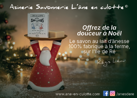 Régis Léau fabrique ses savons directement à la ferme, dans son laboratoire ouvert l’été dernier. Ses savons comportent 10 % de lait de ses ânesses et sont fabriqués artisanalement, avec des ingrédients naturels. Ils ont obtenu une note de 100 % sur Yuka et 19,4/20 sur Inci Beauty, autant dire qu’ils ont été plébiscités ! Proposés dans un joli étui en carton, à l’effigie des ânes de l’île, ses savons sont en vente à l’asinerie du mercredi au dimanche de 15h à 17h30 ou sur RV au 06 08 57 25 94, sur le site internet et chez ses partenaires commerçants sur l’île de Ré, dont la liste est disponible sur le site. www.ane-en-culotte.com Facebook – Instagram : anesdere Asinerie – Savonnerie l’Âne en culotte Le Haut Plumais au Bois-Plage en Ré