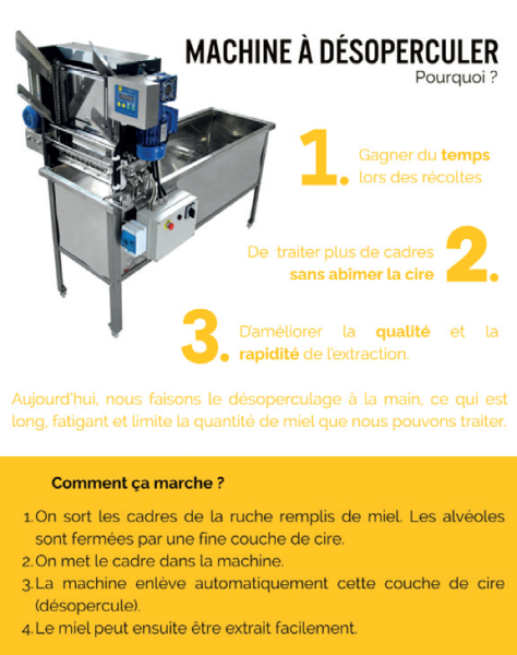 Face au développement de l’activité et à sa forte saisonnalité, la miellerie doit aujourd’hui adapter ses outils de production. L’acquisition d’une machine à désoperculer permettrait d’optimiser l’extraction du miel, de gagner un temps précieux et d’améliorer les conditions de travail de l’équipe. Ce temps libéré serait réinvesti dans le suivi des ruches, essentiel pour préserver la santé des colonies, maintenir la qualité du miel et faire face aux défis croissants du métier : aléas climatiques, maladies ou encore pression des frelons. Au-delà d’un simple investissement technique, ce projet s’inscrit dans une volonté de pérenniser une apiculture locale exigeante, tout en améliorant l’accueil du public à la miellerie, notamment en haute saison.