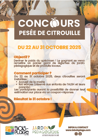 Du 22 au 31 octobre, deux citrouilles seront installées à l’accueil de la mairie (ouvert à tous) et à l’ilot Mômes (réservé aux familles inscrites au centre de loisirs). L’objectif ? Deviner le poids du spécimen et donner son estimation via un coupon-réponse sur place. Le gagnant se verra remettre un panier garni de légumes du jardin pédagogique et de produits locaux.