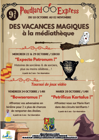 L’APE de Ste Marie (Drôles de Maritais) organise son bal d’Halloween le 1er novembre à partir de 15h (horaire à confirmer). Au programme : buvette, atelier créatif de l’association Le Bocal et spectacle de magie. Salle des Paradis. La Médiathèque propose elle tout un programme des vacances scolaires sur le thème de « Harry Potter » !